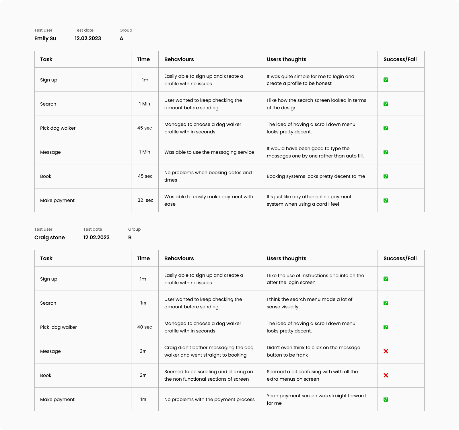 Below are examples of 2 of users I gathered from Groups A and B analysing the thoughts and behaviours of the users interaction with the prototype which had some positive and negative feedbacks.
