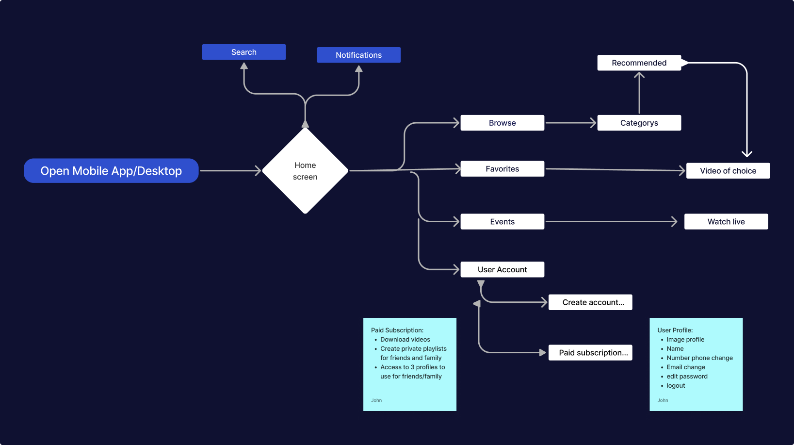 The process of the user-flow journey would take the user through an app to finish a job. The user flow guides through a series of phases from the entry point to a successful in order to watch a livestream as the final action.