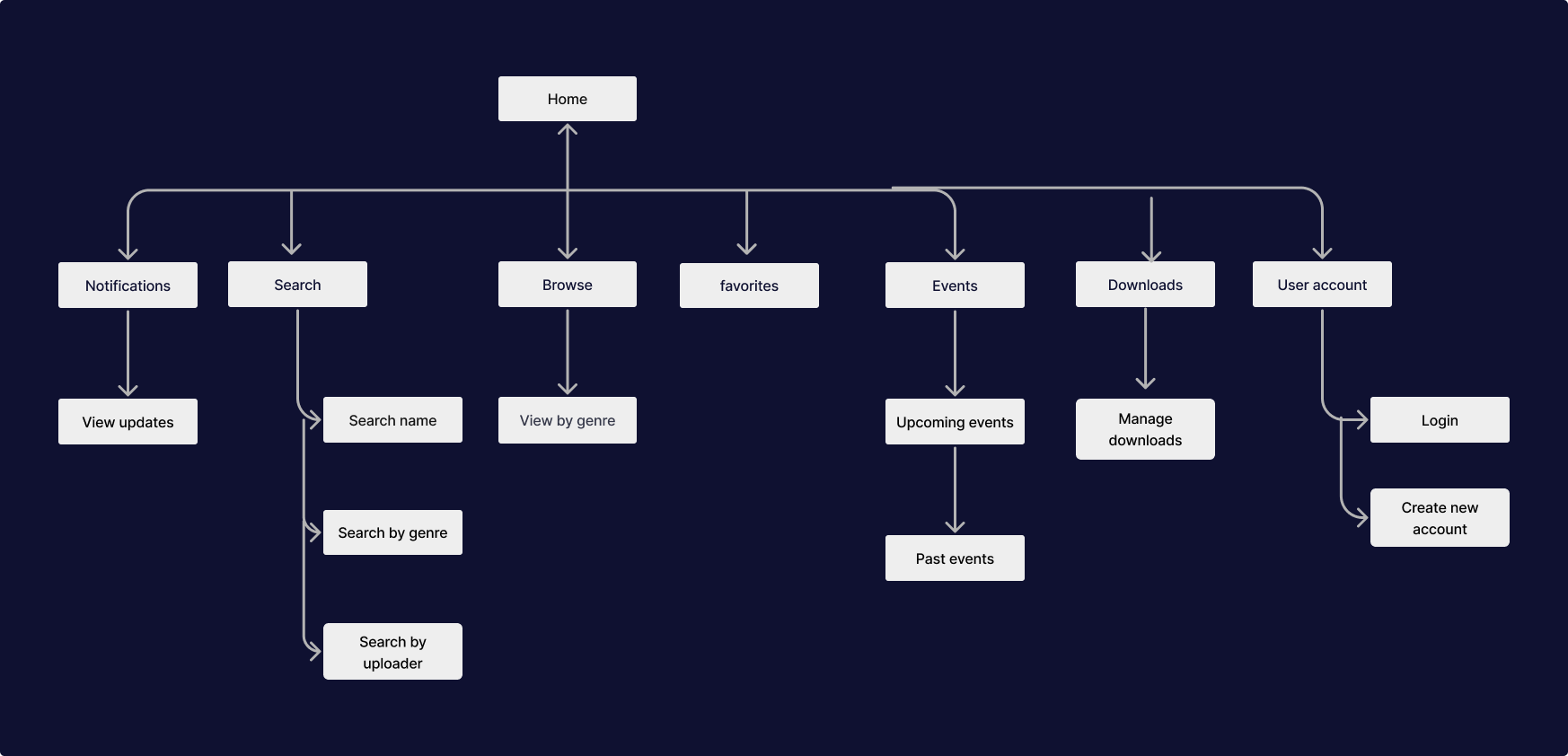 Operational diagram showing the whole overview of the app blueprint, it outlines all of the pages, content, interactions, and behaviours of the entire product.